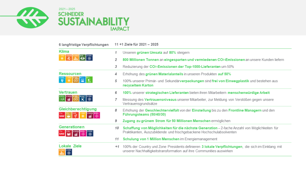 Seit mehr als 15 Jahren verfolgt der global operierende Konzern mit dem Schneider Sustainability Impact (vormals Planet & Society Barometer) einen ehrgeizigen Aktionsplan mit klar definierten Nachhaltigkeitsverpflichtungen. Im neuen Schneider Sustainability Impact (SSI)-Programm, das von 2021 bis 2025 läuft, werden die bisherigen Ziele deutlich angehoben. Es baut auf sechs langfristigen Verpflichtungen auf, die sich an den Zielen der Vereinten Nationen für nachhaltige Entwicklung orientieren. Diese Verpflichtungen sind: Einsatz für eine klimafreundlichere Welt, sparsamer Umgang mit Ressourcen, Befolgung der Prinzipien des Vertrauens, Schaffung von Chancengleichheit, Nutzung der Leistungsfähigkeit aller Generationen und Stärkung lokaler Communities.